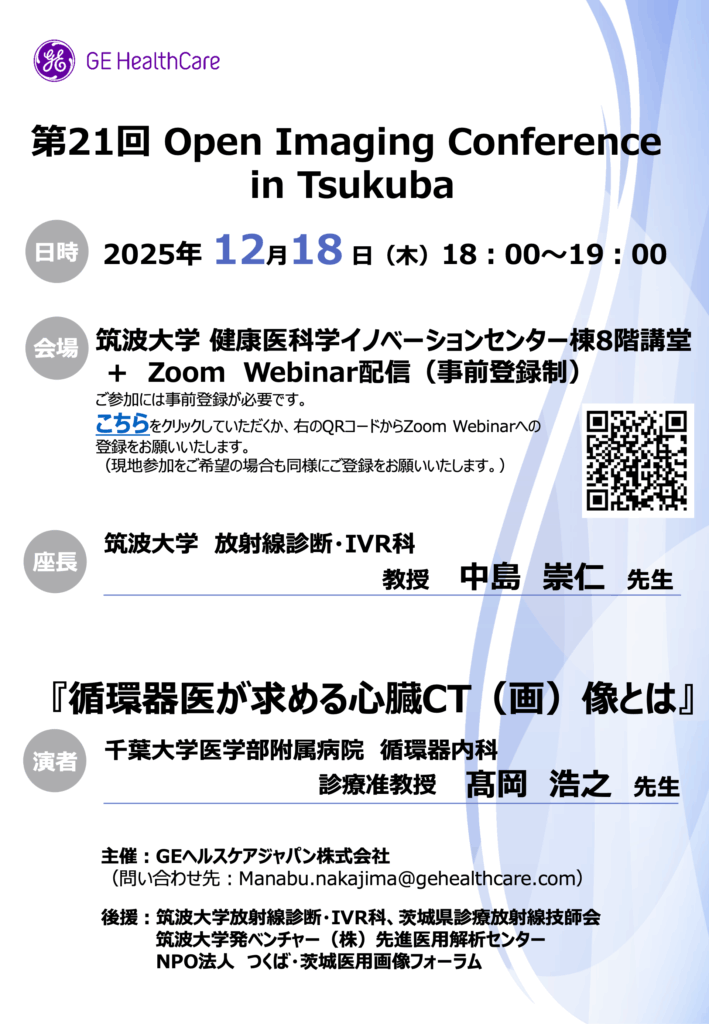 第21回 Open Imaging Conference in Tsukuba 特別講演『循環器医が求める心臓CT(画)像とは』演者:千葉大学医学部附属病院 循環器内科 診療准教授 高岡 浩之 先生日程:2025年 12月18日(火)18:00〜19:00会場:筑波大学健康医科学イノベーション棟8階講堂 +Zoom Webinar 配信(事前登録制)https://zoom.us/webinar/register/WN_ilHkZWeXQgSB2CqVaFdezA